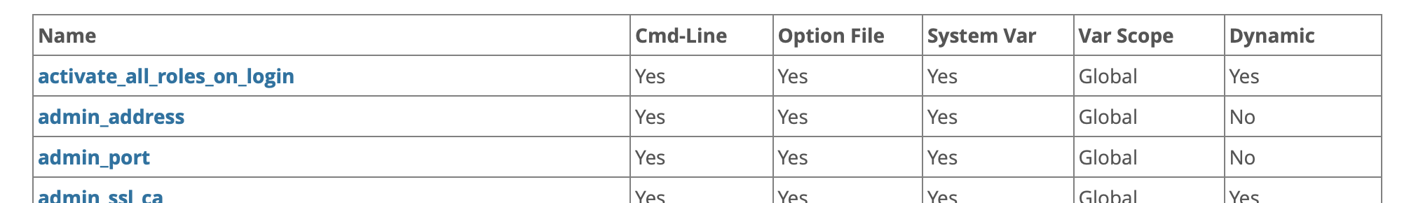 - Cmd-Line: 명령줄 옵션으로 전달해서 변경이 가능한지 여부입니다. 해당 옵션이 YES 인 경우 명령행 인자로 전달하여 옵션을 지정할 수 있습니다.