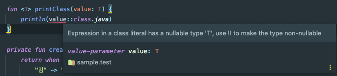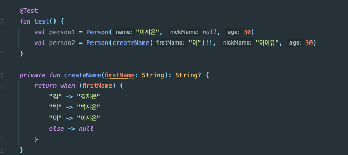 하지만 개발을 하다보면 어떤 Nullable 한 값을 리턴하는 함수를 통하여 얻어낸 값을 NonNull 타입에 할당하고 싶은 경우가 있을 것입니다. 그럴때는 !! 연산자를 사용하면 얻어낸 Nullable 한 타입이 해당 연산에서는 NonNull 하다고 컴파일러에게 알릴 수 있습니다.
