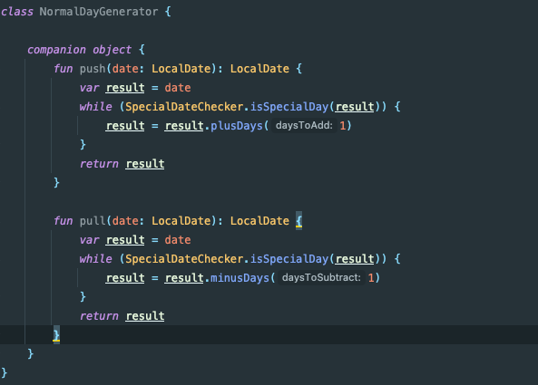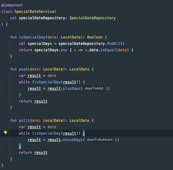 이런 프로세스를 생성하는데 dday 가 특정일 (공휴일이나 주말 같은) 날 일 경우 그런 특별한 날이 아닌 날까지 밀거나 당기는 기능이 필요했습니다. '특별한 날' 은 어떤 API 를 통해 매년 DataBase 에 적재시켜놓고 있었고, 밀고 당기는 기능도 존재하는 상황이었습니다.